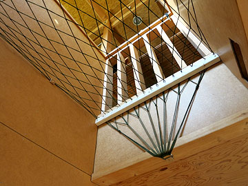 ネットの材質は丈夫な金網も考えられたが、施工が複雑になる。最終的に空中ブランコ下の安全ネットのように、弾力性のある繊維質のネットを使うことにした。